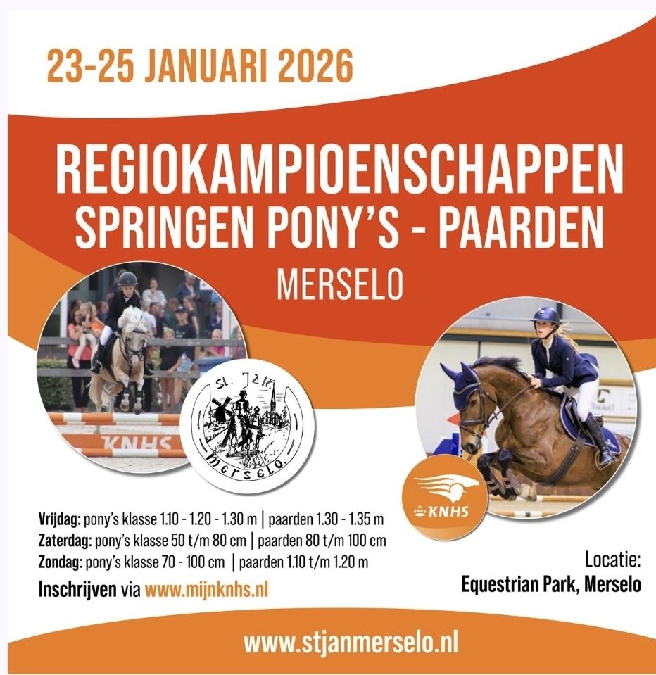 A.s. weekend van 23-25 januari organiseert St. Jan Merselo de indoor regiokampioenschappen springen voor paarden én pony’s in Merselo bij Equestrian Park (voormalig Hermkus Hof).