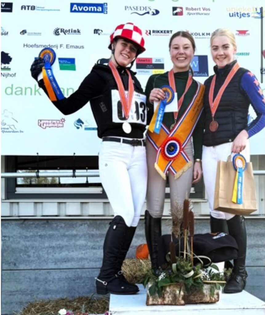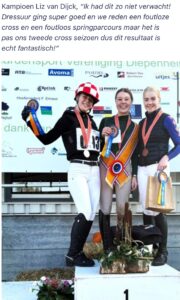 Liz van Dijck is 18 oktober afgereisd naar Diepenheim voor de Nederlandse kampioenschappen eventing. En met een fantastisch resultaat. Ze werd Nederlands kampioen met haar pony Ophelia Francis in de klasse DE B.